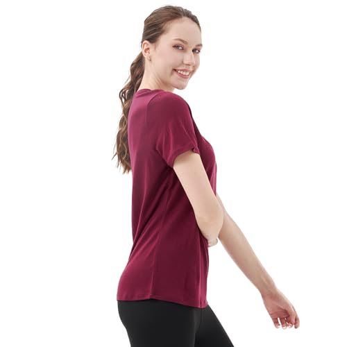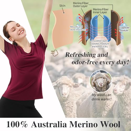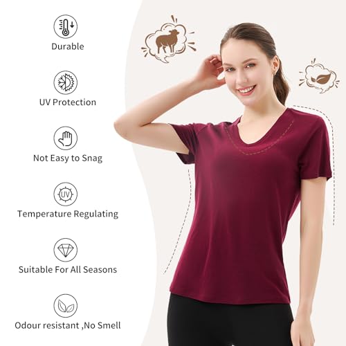 Merino Protect 100% Merino Wool V Neck T-Shirt for Women Short Sleeve Base Layers Odor Resistance Tops for Outdoor Hiking